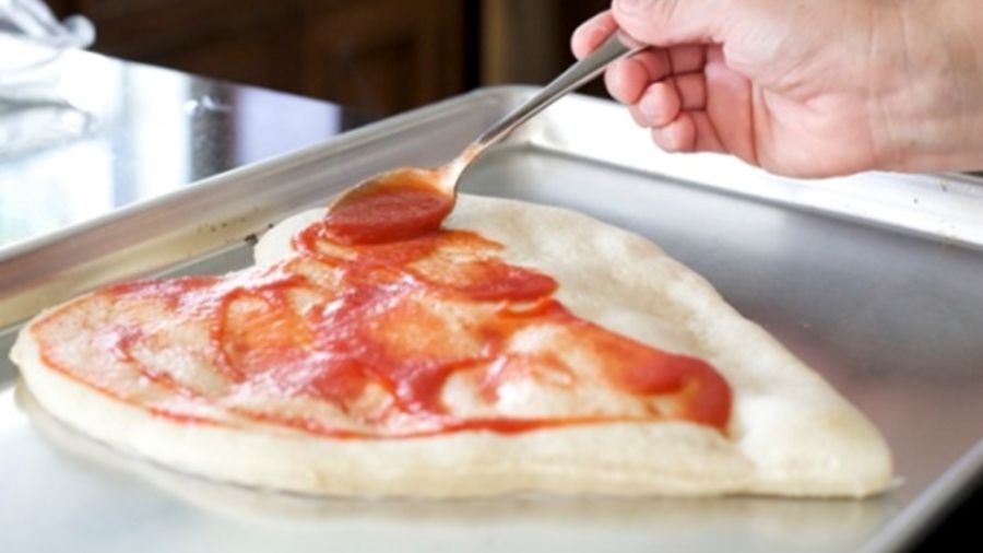 Remove the dough from the oven and spread the tomato sauce on top.