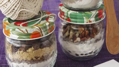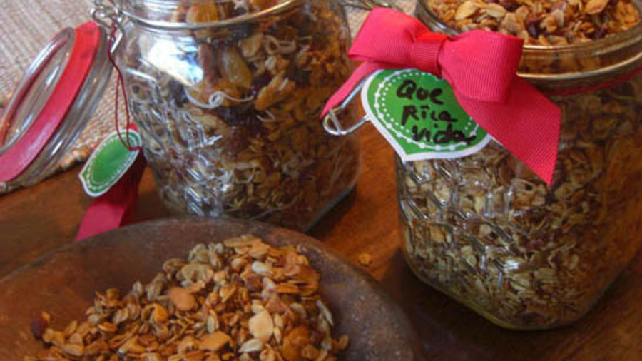 Let cool when finished and store in glass jars to keep crunchy. Decorate the jars.