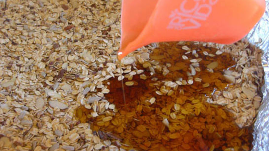 Mix with a wooden spoon to evenly distribute the oil and honey. Bake for 50 minutes.