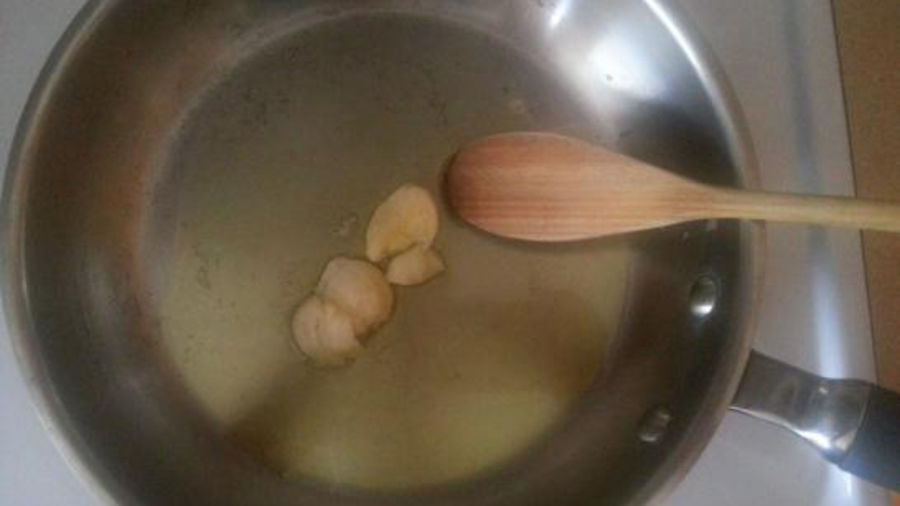 Place a large pan on the stovetop, add oil and cook the garlic.