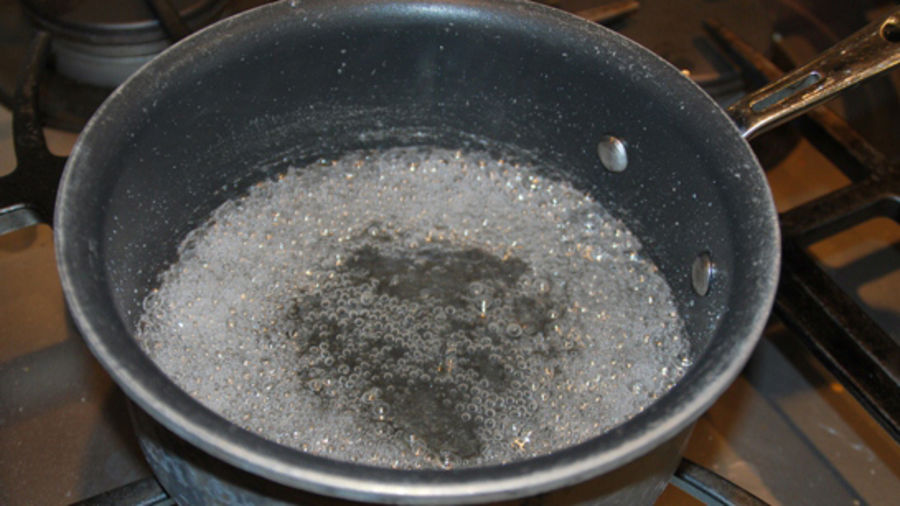 Now, while the milk is simmering, is a good time to make the syrup. Take the water and sugar you set aside for the simple syrup, and pour them into a pot. Bring it to a boil and then lower the flame. Let it simmer until half the liquid is gone.