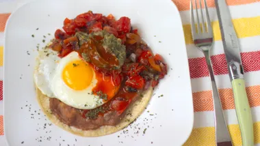 • Fresh tomato sauce and refried beans provide a simple addition to these authentic variation on huevos rancheros - prefect for a Mexican breakfast.
