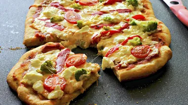 Just a few days ago I came across a fruit called jackfruit and I immediately began investigating its best uses. It occurred to me to prepare this jackfruit pizza and was then able to confirm that its flavor and texture was a lot like artichoke. In this case, I used canned green jackfruit, but you can find this canned ripe jackfruit. By mixing pieces of jackfruit, mayonnaise, parmesan cheese and garlic, you create a delicious sauce to go with Pillsbury™ Classic Crust Pizza Crust. You can add a few slices of tomato on top to enhance the flavor.