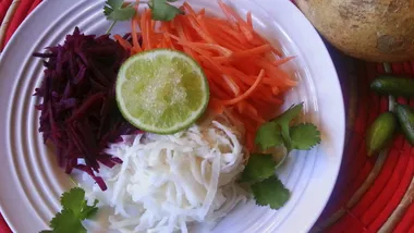 Arrange the fruit and vegetables in a large plate and add the lemons, salt and pequin pepper.