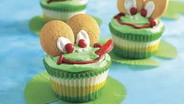 Monkeys: Frost 6 cupcakes with chocolate frosting. In small bowl, mix 1 tablespoon chocolate frosting and 2 tablespoons vanilla frosting to make light brown. For muzzle, spread or pipe circle of light brown on each cupcake that starts in middle and extends to edge; pipe small tuft of hair on opposite edge. For each eye, attach brown baking bit to marshmallow half with frosting; place on cupcakes. With black frosting, pipe on nose and mouth. For ears, add mints.