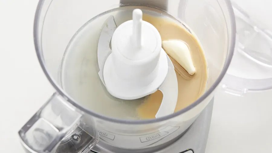 Put the tahini, lemon juice, water, salt and pepper in the blender. Process until smooth, adding the garlic clove while the blender is on. Make sure there are no large chunks of garlic left.