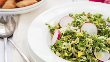 Add the sautéed vegetables and shaved Parmesan cheese to the kale, mix well, and serve.
