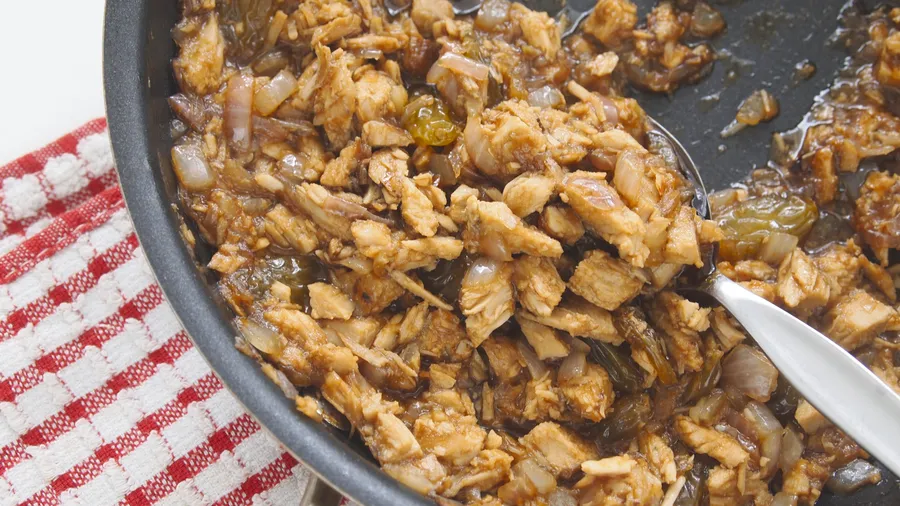 Add the chopped roasted lechón pork and stir well. Add the raisins, Hoisin sauce, soy sauce and 1/4 cup water. Let it boil and cook for a few minutes until almost all the water has evaporated, but without it being dry. Season with salt and pepper if necessary. Turn down the heat and set aside until cold.
