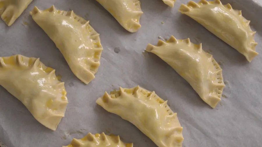 Dip your fingertip in the egg white and rub it on the dough to close the empanada and seal it well. Place the empanadas on a baking tray.