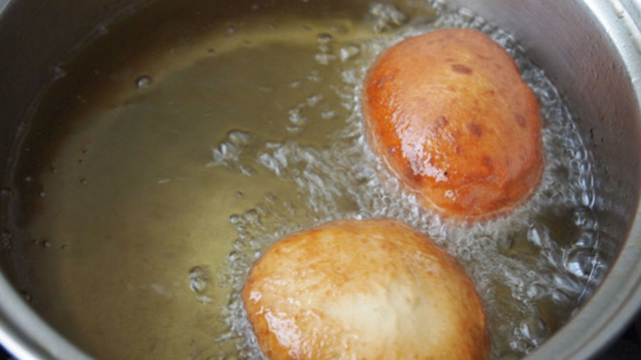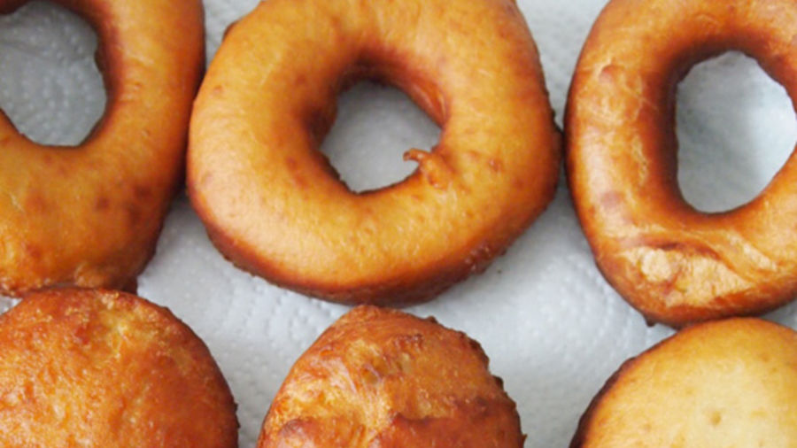 Heat the oil over medium heat. Fry the donuts (be careful when picking them so they don’t lose their shape).