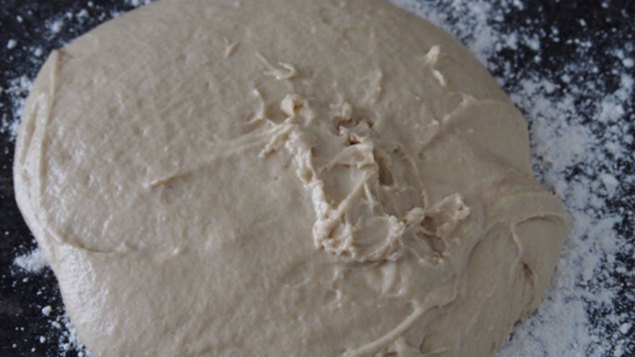 Sprinkle flour liberally over a flat surface so you can work the dough. Knead the dough, adding more flour if necessary so the dough doesn’t stick to your fingers.