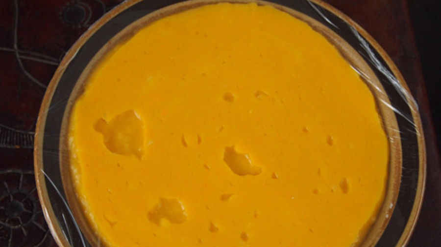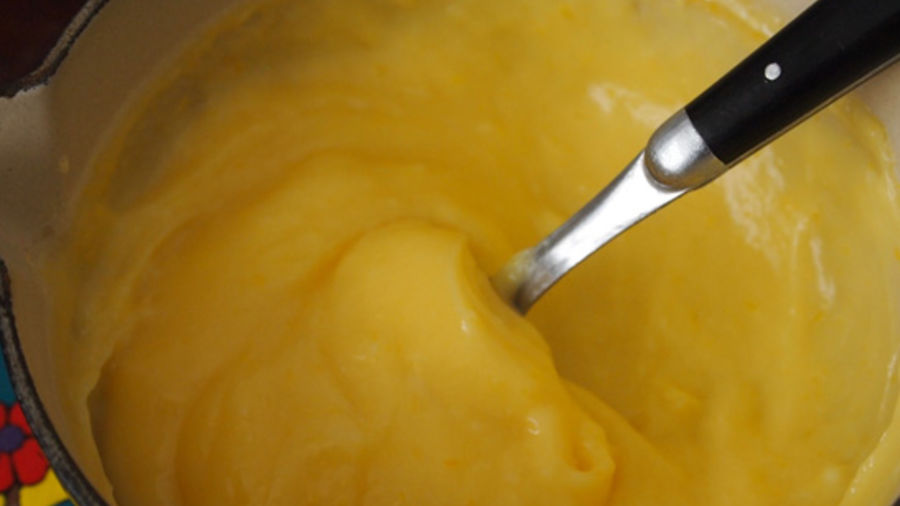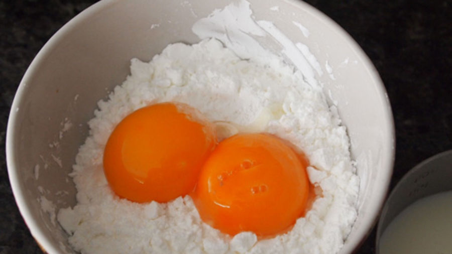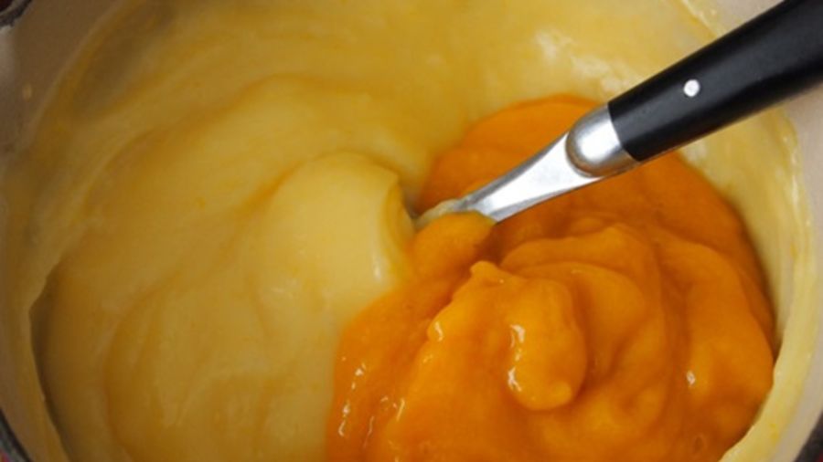 For the mango cream: Boil the milk in a medium pot. Combine the sugar, cornstarch, egg yolks and two tablespoons of water.