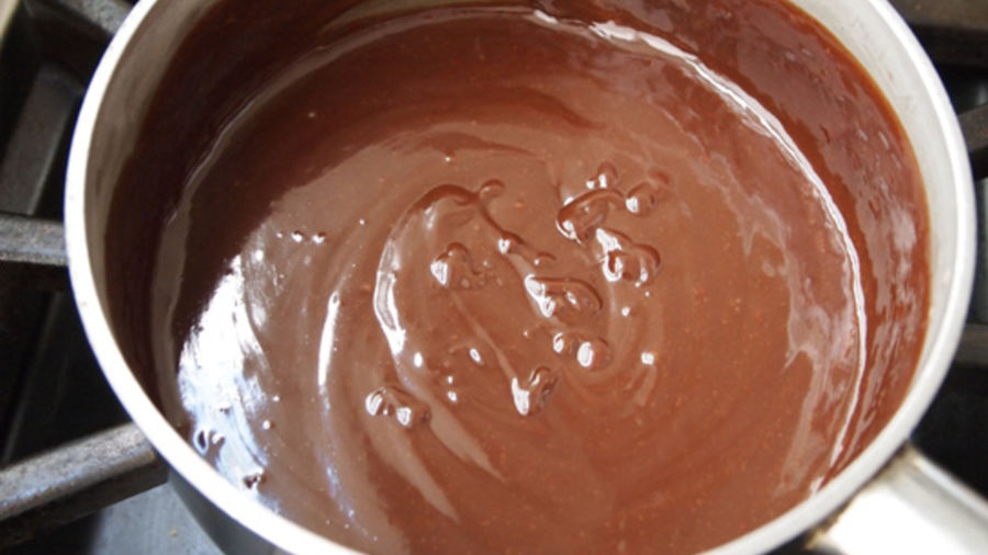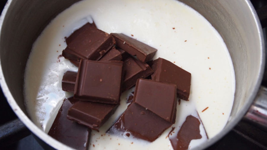 For the ganache: Heat the heavy cream in a pot and bring to a boil. Turn off the stove. Add the chopped chocolate and, after a few minutes, stir with a spatula.