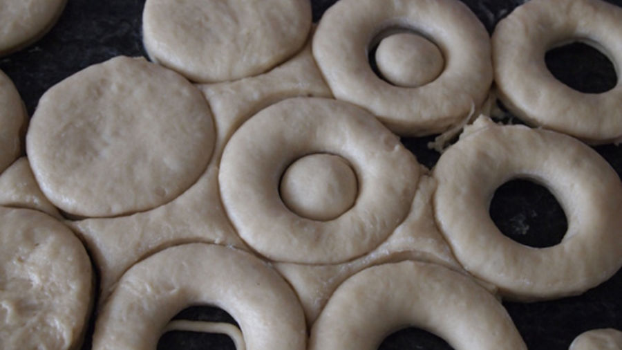 Return the dough to your workstation. Add a bit of flour and use a rolling pin to stretch the dough out to 1/2-inch thickness. You can make some doughnuts with the hole in the middle, and others without the hole, like jelly doughnuts. Cover with a kitchen cloth and let sit for 30 more minutes.