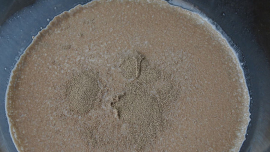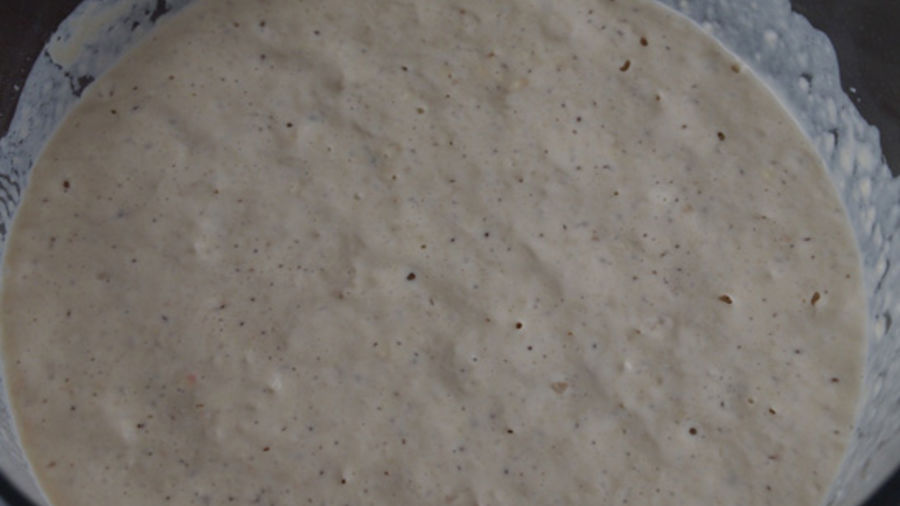 Cover with a kitchen towel and leave in a warm spot to ferment for 45 minutes. The dough should have doubled in volume and should look spongy and bubbly.
