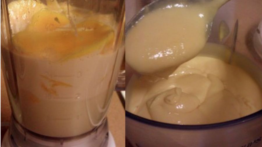Add the mango flesh, the condensed milk and the evaporated milk to the blender, mix well until getting a thick consistency.