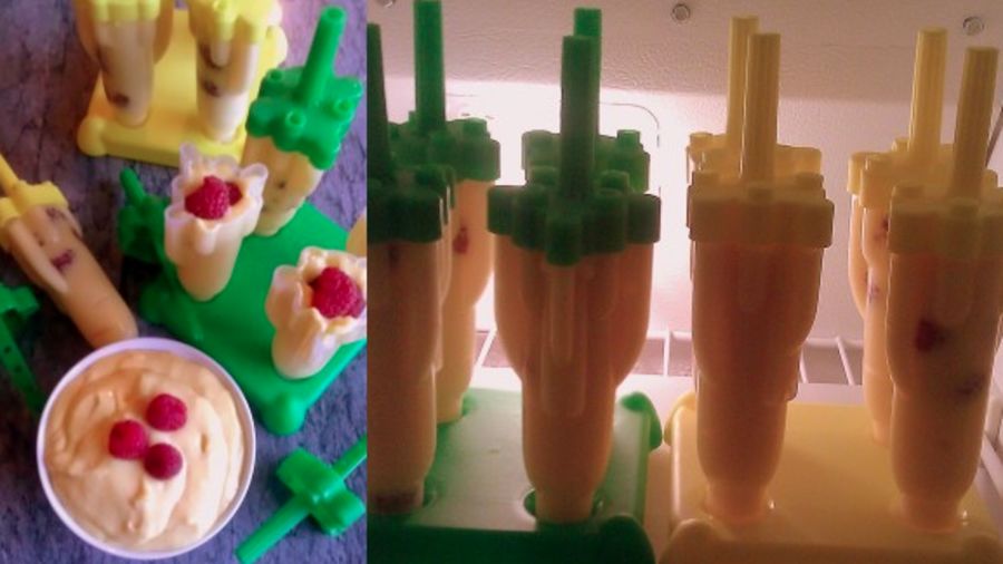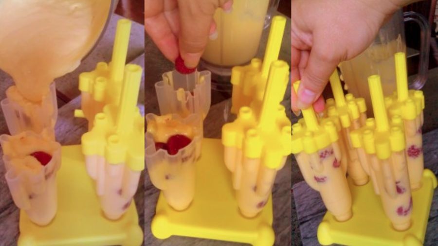 Place your ice pop molds and pour the mango cream, add 3 raspberries per pop and seal.