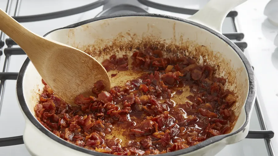 In a skillet, cook the bacon over medium heat until golden brown. Stir occasionally to keep the bacon from sticking to the bottom of the pan.