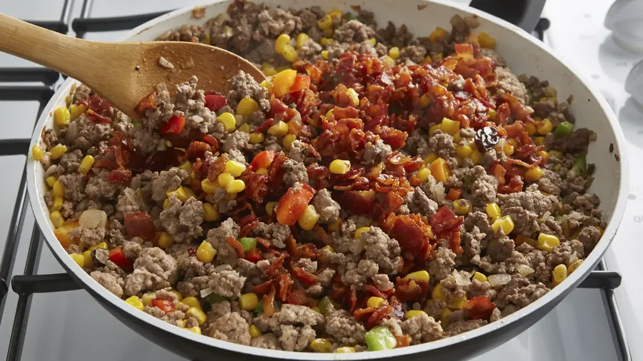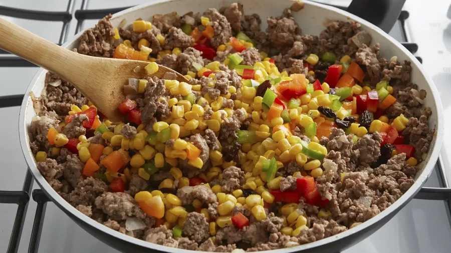 Season with salt and pepper, then stir-in the corn, raisins and bell peppers. Cover the frying pan with a lid and continue cooking for 10 minutes.