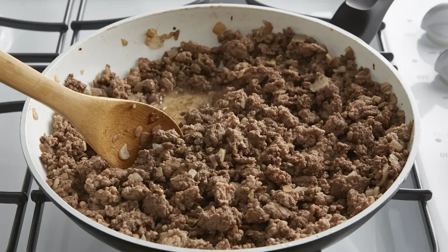 In a separate frying pan, sauté the onion and garlic until they begin to caramelize. Add the ground pork and beef- mix well and make sure the meat cooks evenly.