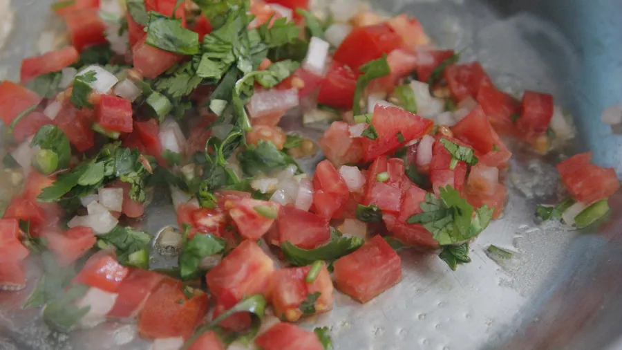 Add the pico de gallo and cook until the tomato changes from a vibrant red to an orange color.