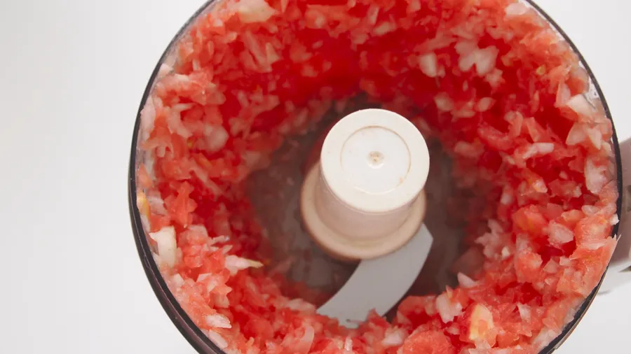 Using a food processor, chop the tomatoes, onion, and garlic until they’re chopped but not liquid. Put them in a pot along with the chicken broth and carrots, and take it to a boil. Cook for 15 – 20 minutes.