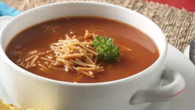 In the meantime, heat the oil in a pan and brown the noodles slightly. Add them to the soup and cook them until they’re soft. Check the soup and season with salt and pepper.