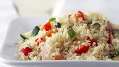 • End-of-year dinners, especially Thanksgiving dinners, are famous for the amount of food everyone eats without caring about combinations or calories. An abundance of variety is important as well as being able to have a good time alongside family and friends–the central part of this jovial celebration. I have always liked to experiment with different ingredients in my meals, and Thanksgiving is no exception. But to tell the truth, I'm not a real fan of serving a stuffed turkey; I would rather serve the stuffing as a separate side-dish to keep the turkey lighter and tastier. This presents the perfect opportunity to serve a unique type of 'stuffing' such as this vegetable couscous with apricots. Couscous in general is very simple to make and can be prepared quickly since no cooking is necessary. Just hot liquid is required, such as water or both, then cover and let sit for a few minutes. In the end, the grains absorb the liquid to form a light, fluffy texture–a delicious addition and interesting conversation point for any Thanksgiving meal. To speed up preparation, only use quality frozen vegetables to preserve the rich flavor of this recipe without sacrificing extra time in the kitchen. In this busy age, you can't afford to forget any time-saving shortcuts!