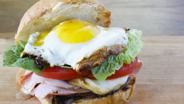 Once the meat it ready, serve on the bread with ham, cheese and fried egg.