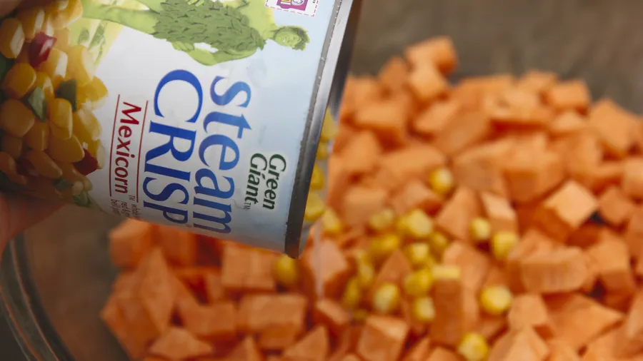 Mix the peeled sweet potatoes, corn, salt, oil and pepper until everything is mixed well.