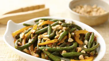A 1-pound bag of frozen cut green beans can be used in place of the whole green beans.