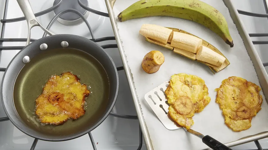 When the plantains are more or less cooked, remove them from your frying pan and flatten to about one-quarter-inch thick with a plate or a rolling pin.