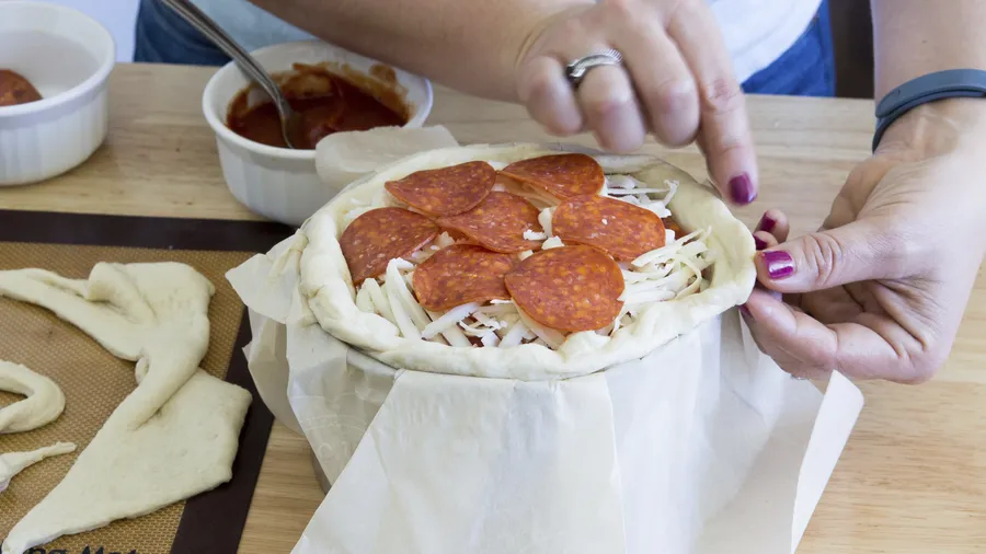 Meanwhile, line pan with cooking parchment paper so that ends of paper stick up and out of pan. Cut long strip of dough at least 1/2 inch wider than height of pan. Carefully drape long strip of dough around inside edge of pan to line, leaving 1/2 inch hanging over outside edge of pan and bottom of pan open. Pinch seam to seal.