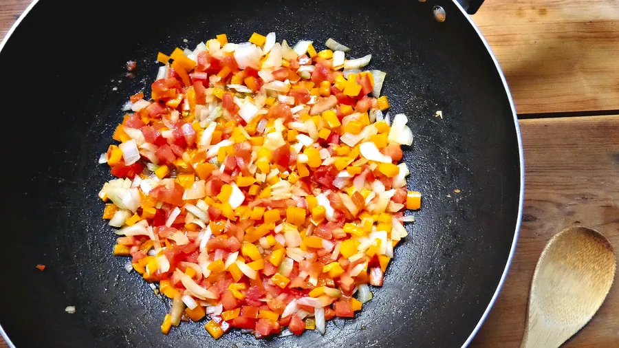Heat the oil in a large pan or wok on high. Stir tomatoes, yellow peppers and onion for 3 to 5 minutes; add the garlic and sauté for another 30 seconds.
