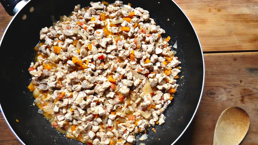 Add finely chopped pork and oregano; cook until it is no longer pink; season with salt and black pepper, to taste. Cover pan and reduce to low heat stirring occasionally, for 12 to 15 minutes until all the juice of the meat has evaporated and the meat is soft.