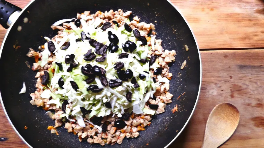 Add the cabbage, black olives and white vinegar. Season with more salt, if necessary.