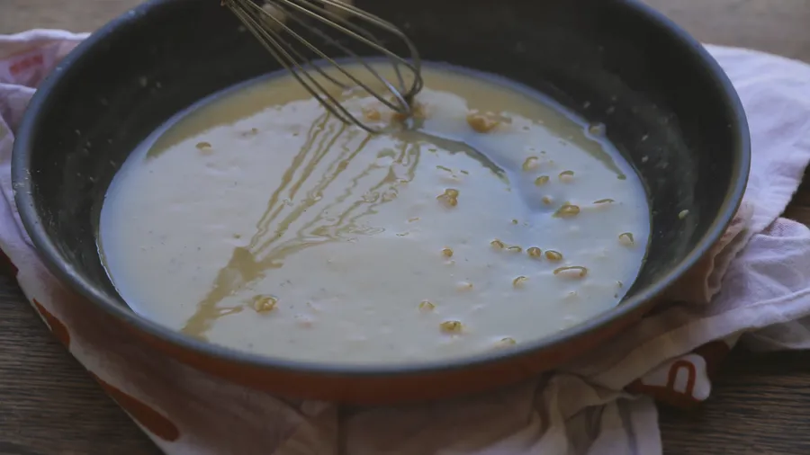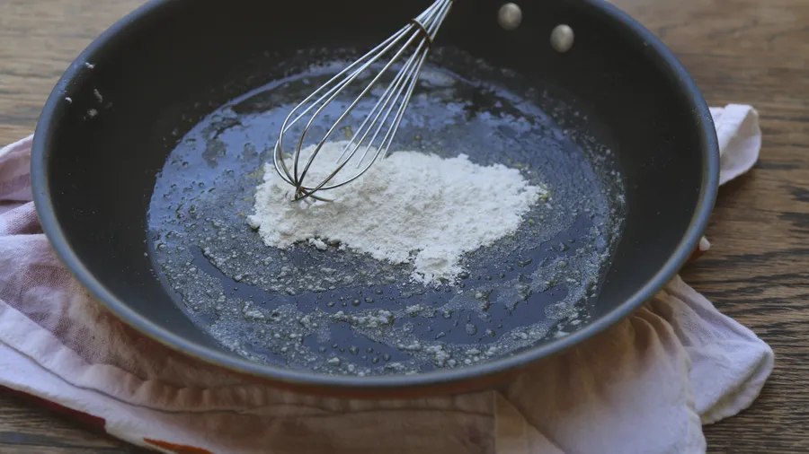 Gradually add turkey or chicken broth and pisco whisking until blended.