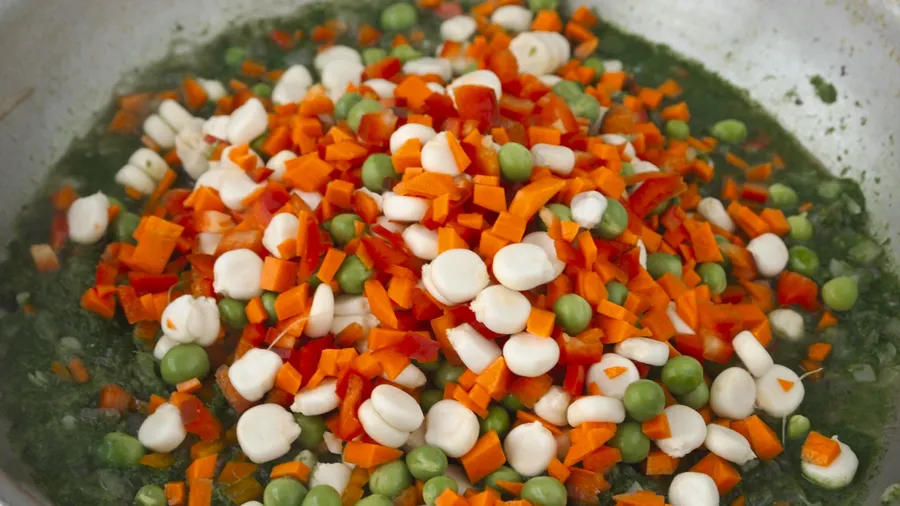 Incorporate the pepper, carrots, corn, rice, salt and pepper.