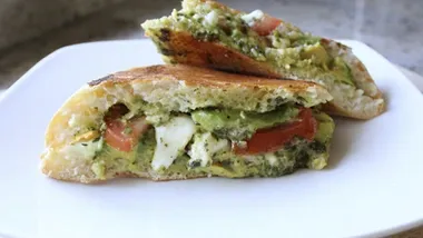• Every time I go to San Francisco to visit my tia, I make it my business to visit a tiny, local Italian restaurant not far from her house in Berkeley. The place is as big as a medium sized living room and is always packed to the gills with food-freaks like myself. I don't mind waiting outside for a table for about an hour and then being crunched up next to the patrons at the table next to me with barely any elbowroom to speak of. Why? Because of the amazing paninis that this family owned restaurant serves. These beautiful pressed sandwiches are on of my favorite Italian dishes to eat when I'm looking for a quick bite. I started making these puppies around 10 years ago and I think I've gotten pretty darn close to those I eat up in Berkeley. The secret, I've since learned, is the homemade pesto sauce that engulfs this dish. I like to take my time with it and make it just right because it makes all the difference in the world. Have a shot at it and I guarantee you will feel the same way I do about this sandwich… pure LOVE.