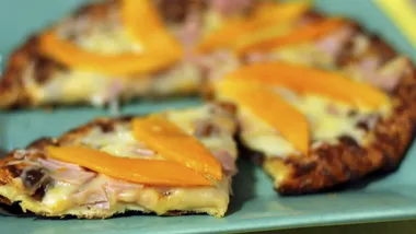 Use a kitchen brush to paint the pita with the olive and garlic mixture (set the leftover oil aside). Place strips of onions on the pita and then a layer of shredded cheese.