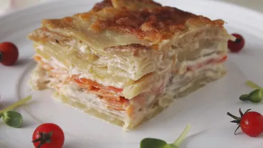 Cover loosely with foil paper and bake in preheated oven for 1 hour. During the last few minutes, bake under broiler to brown the cheese. Remove from oven and let stand for 20 minutes before serving.