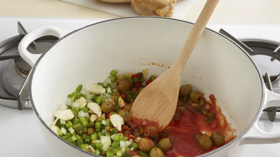 Stir in sofrito, olives, capers, season, tomato sauce, cumin and sauté for about 4 minutes at low heat.