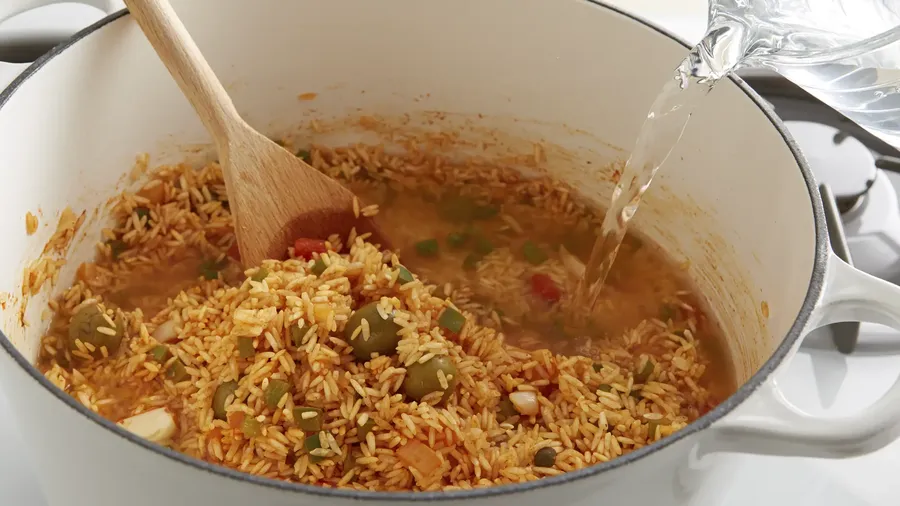 Stir in rice. Mix well with the sofrito, add water; bring to boil.