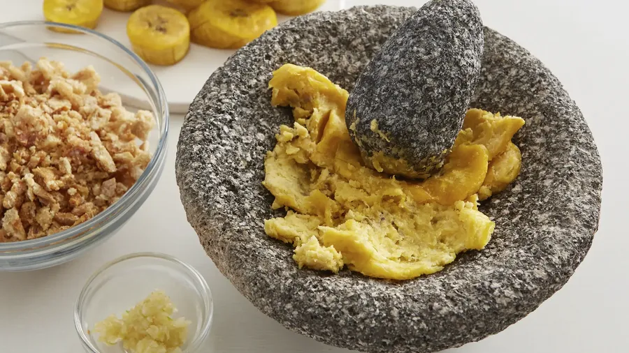 Remove plantains from skillet. Mash with a a mortar and pestle. Add the garlic and chicharrón and mash into the plantains.