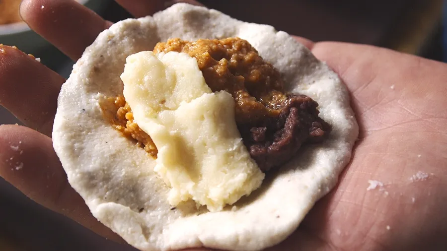 Using portions of about 1/2 cup of tortilla mix, pat the mix until you get a tortilla of about the size of your palm. Add a tablespoon (approx.) of beans, quesillo, and chicharron.
