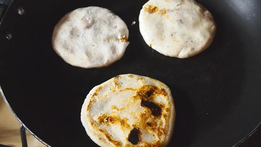Cook the pupusas revueltas in a non-stick pan, turning each side twice until you can see they’re cooked.