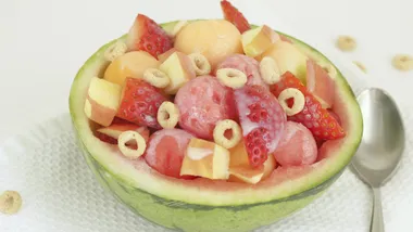 This fun bento box contains both fruity cereal and lots of fresh fruit. Pack a colorful box for a morning--or any time of day--energy boost.