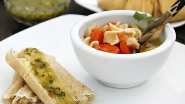 Masa can be bought ready-made at Mexican markets or you can make your own by following the directions on a packet of corn flour.