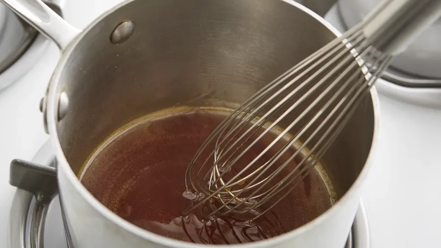 To prepare the flan, add sugar to a medium-sized pot and stir continuously until all the sugar has dissolved and is amber in color, forming a caramel, over medium heat.