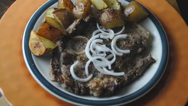 Preparing the Potatoes Chop the potatoes into three or four pieces, about 2 square inches each. Place in the roasting pan around the lamb. Distribute pieces of lard around them, and then sprinkle salt, thyme and garlic over. Pour sherry wine over the lamb. It will seep into potatoes as everything cooks. Pour the cup of water over to one side of the pan, so that you do not rinse the condiments off the lamb or potatoes.
